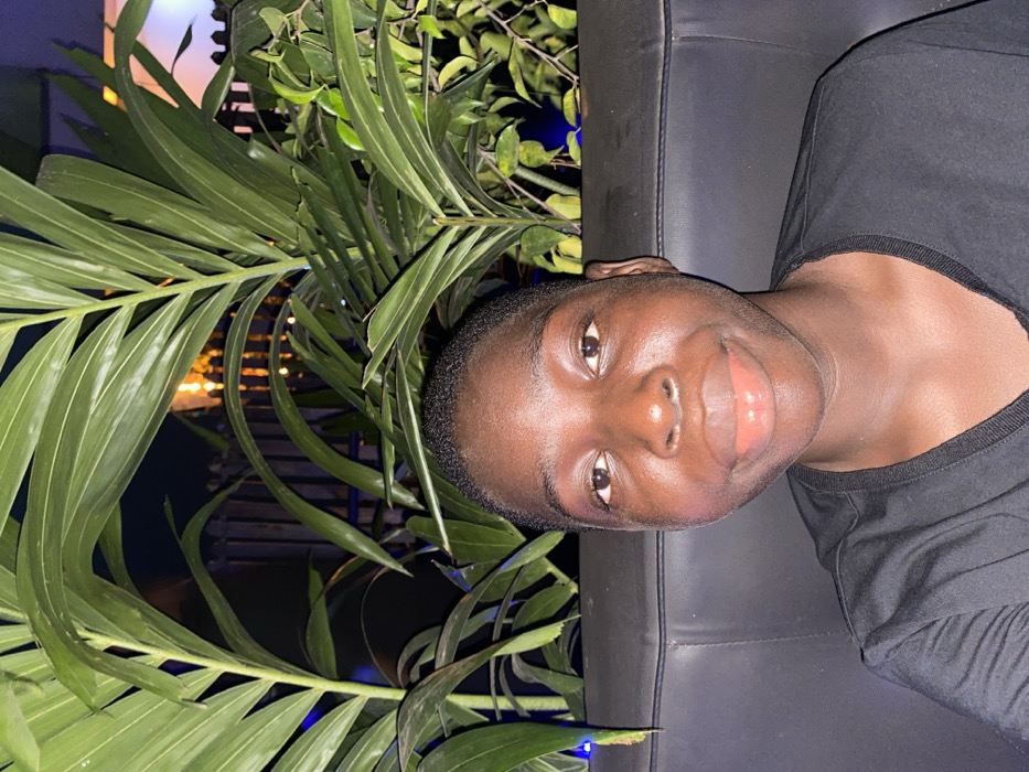 A person with dark skin smiles directly at the camera, revealing their teeth and glossy lips. The person wears a black shirt with long sleeves. A potted palm sits to the person's left, adding a tropical feel to the scene. A black couch or seat is situated to the right of the person. A building or other light source with grid-like details is visible in the background through the palm leaves.