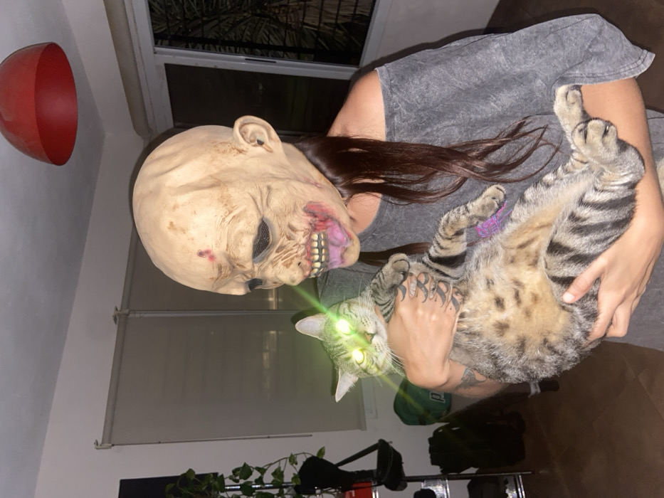 - "A person wearing a zombie mask holds a tabby cat with glowing green eyes" by FM-RGoS63, licensed under CC BY 4.0