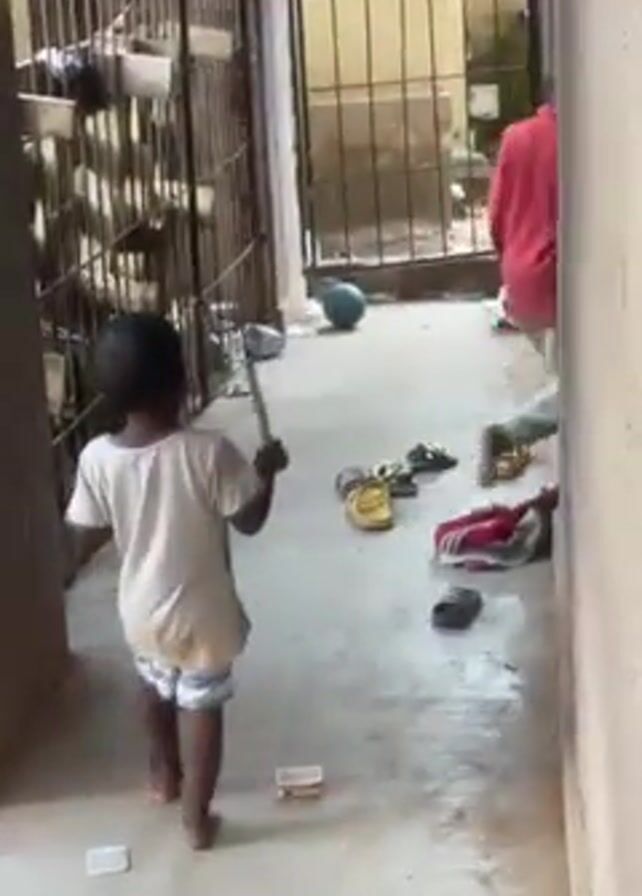 two young children, one in a white t-shirt and patterned shorts, and the other in a red shirt and tan pants, standing in an indoor area with a cluttered floor. The child in white is holding a small object in their hand and walking toward a gated doorway or enclosure. The floor is strewn with sandals, pieces of trash, and balls. The gated doorway leads to an outdoor area that is partially visible. The child in the red shirt is standing further back in the area, closer to a partially obscured doorway.