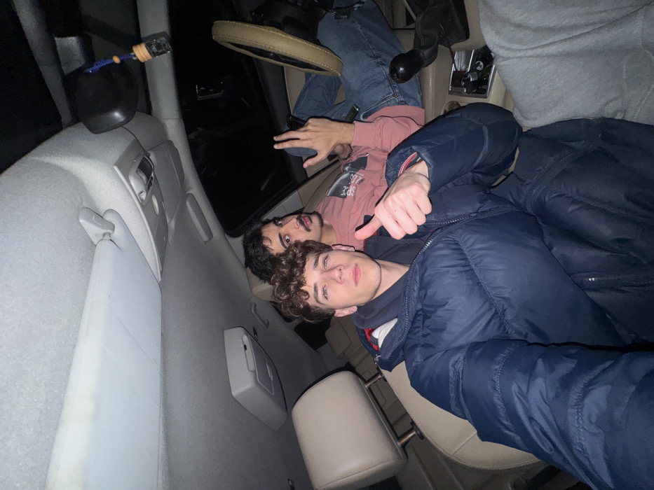 The image captures the interior of a passenger vehicle, appearing to be stationary during nighttime or in a dark environment. Two male individuals are prominently featured, with a partial view of a third person. In the foreground, a young male with short, curly brown hair and a fair complexion is positioned, likely in the front passenger seat. He wears a dark blue puffer jacket over a dark hooded garment and directly faces the camera, making eye contact. His right hand is raised, displaying a "thumbs up" gesture. Behind him, in the driver's seat, a second male with dark, wavy hair and a mustache and beard also looks towards the camera. He is wearing a long-sleeved, light coral or pink shirt. His left leg is elevated and rests across the dashboard, and his left hand is raised near his chest, forming a hand gesture with his thumb and ring finger pressed together, and index, middle, and pinky fingers extended. In the lower right corner, a leg clad in grey sweatpants is partially visible, indicating the presence of a third individual, possibly in the rear seat or positioned next to the foreground subject. The vehicle's interior features a light-colored headliner and seat upholstery. Visible overhead components include a sun visor, an overhead console with light controls, and a rearview mirror from which a blue and white air freshener hangs. The steering wheel, covered in a tan or light brown material, and a gear shift are visible on the right side of the frame. The precise location within the city of Mirandela, Portugal, cannot be determined from the visual information contained within the image. The scene is confined to the interior of a vehicle.