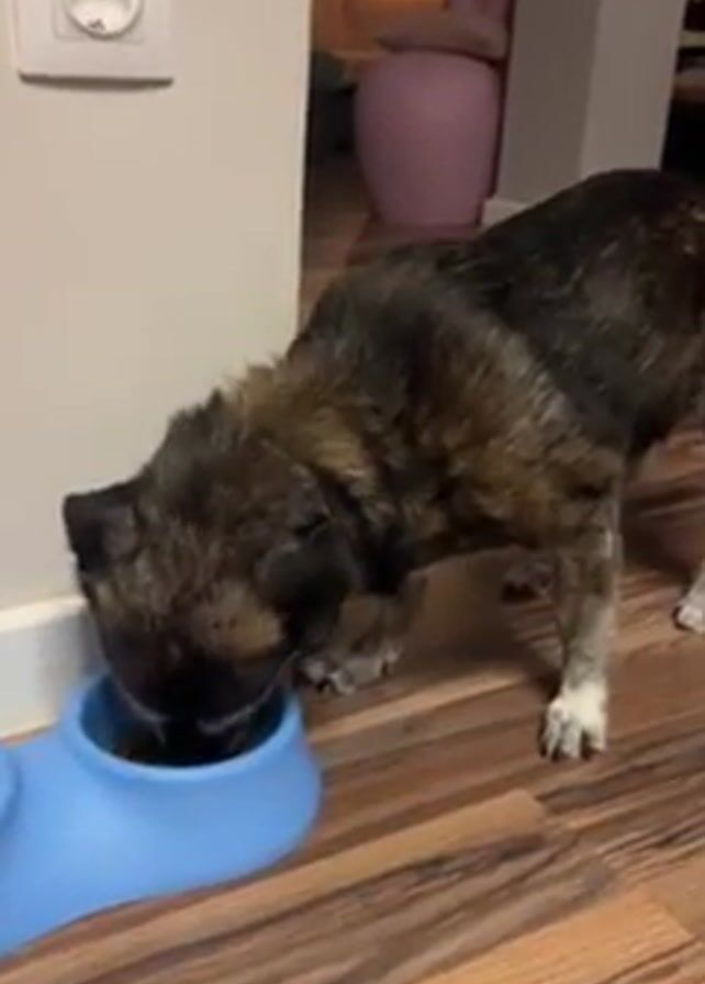 - "A small, mixed-breed dog with a grey muzzle and brown and black fur eats from a blue, oblong-shaped pet bowl" by FM-Dbw9B3, licensed under CC BY 4.0