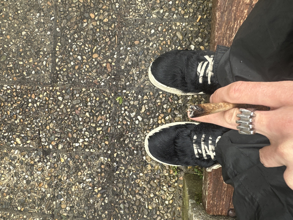 The image presents a high-angle view focused on an individual's lower body and the immediate ground environment in Les Ulis, France. The subject wears black pants and black sneakers featuring black fur/pony hair uppers, white laces, and white soles/trim. The visible left hand, adorned with a silver-colored ring displaying a multi-band or corrugated design on the ring finger, holds a partially consumed, hand-rolled item with a brownish wrapper and a charred tip, consistent with a lit joint or cigarette. The individual appears to be seated, with a dark brown, wood-like surface (possibly a bench) and a grey concrete block visible below the left leg. The ground surface consists of exposed aggregate concrete pavement with embedded multi-colored pebbles (grey, brown, white, tan) and visible grid lines. The pavement appears damp. Small green plant sprouts are present in the cracks, and discarded cigarette butts are visible on the ground to the right.