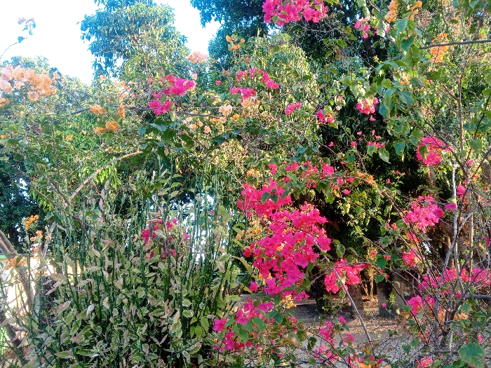 The image displays an outdoor environment in Tinaquillo, Venezuela, under natural daylight. The scene is dominated by dense plant life. Multiple Bougainvillea plants are present, exhibiting clusters of vibrant fuchsia-pink and orange-peach colored bracts among green foliage. In the lower-left and center-left, a distinct plant with erect, somewhat segmented stems and variegated green and light-green leaves, consistent with *Pedilanthus tithymaloides*, is visible. The background consists of a thick canopy of various green trees and shrubs. A bright, clear sky occupies the upper portion of the frame. A dirt or gravel surface is partially observable through the vegetation in the lower-right area. No individuals or explicit actions are depicted.