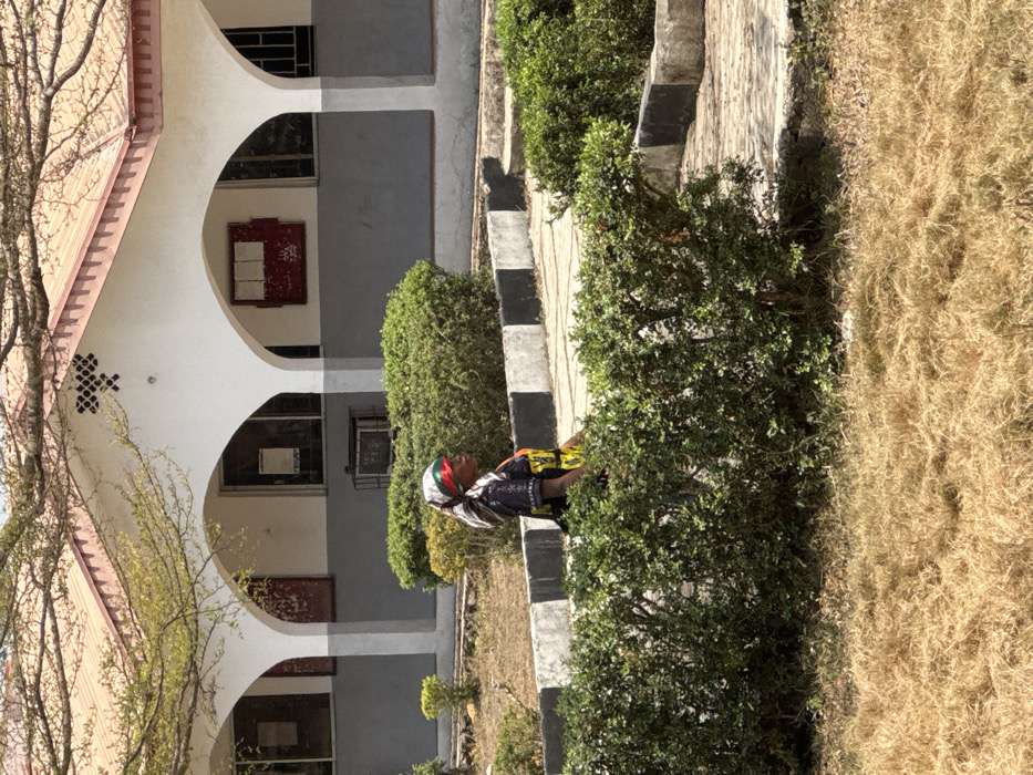 An outdoor scene in Osu, Nigeria, depicts a single adult female in profile, walking from left to right across the mid-ground. She wears a patterned headscarf featuring white, black, red, and green colors, and a dark, short-sleeved top with prominent yellow/orange sections. Her skin is dark-toned. She is partially obscured by a dense line of green bushes in the foreground. Behind her, a paved walkway or area is visible, bordered by a curb painted with alternating black and white stripes, and additional green shrubbery. In the background, a two-story building features a light brown or reddish-orange tiled roof, white upper walls with multiple arched openings, and a grey lower section. Some arched openings contain dark windowpanes, while others show exposed red surfaces or peeling paint. A decorative, dark diamond-patterned vent is visible on the white wall below the roofline. The foreground consists of dry, light brown grass. Sparse tree branches with light green leaves are visible overhead in the top portion of the frame under bright sunlight.