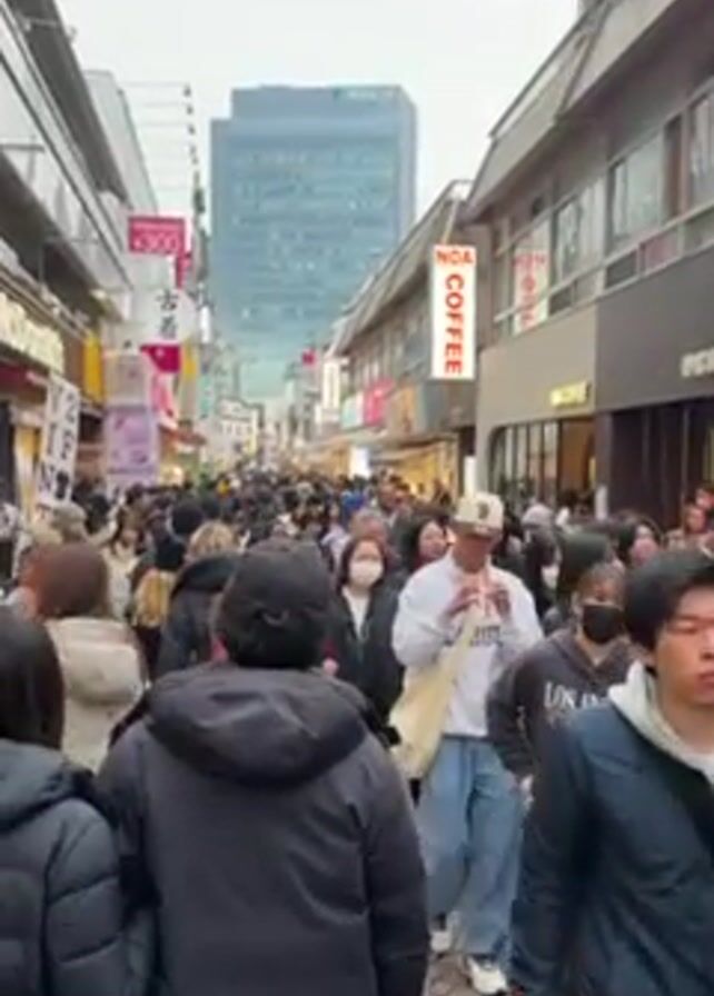dense crowd of people walking down a narrow street. The street is lined with shops and buildings, some with signs written in Japanese. Most of the people are wearing winter clothing, and some are wearing masks. The sky is overcast. The crowd moves slowly down the street, and there is a general sense of busyness. The buildings are tightly packed, and the tall one at the end of the street is made of glass and steel. The street surface is paved.
