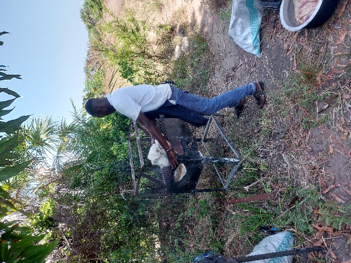 The image depicts an outdoor cooking scene in a semi-vegetated, unpaved area consistent with informal food preparation zones or roadside stalls found in various districts of Dar es-Salaam, Tanzania