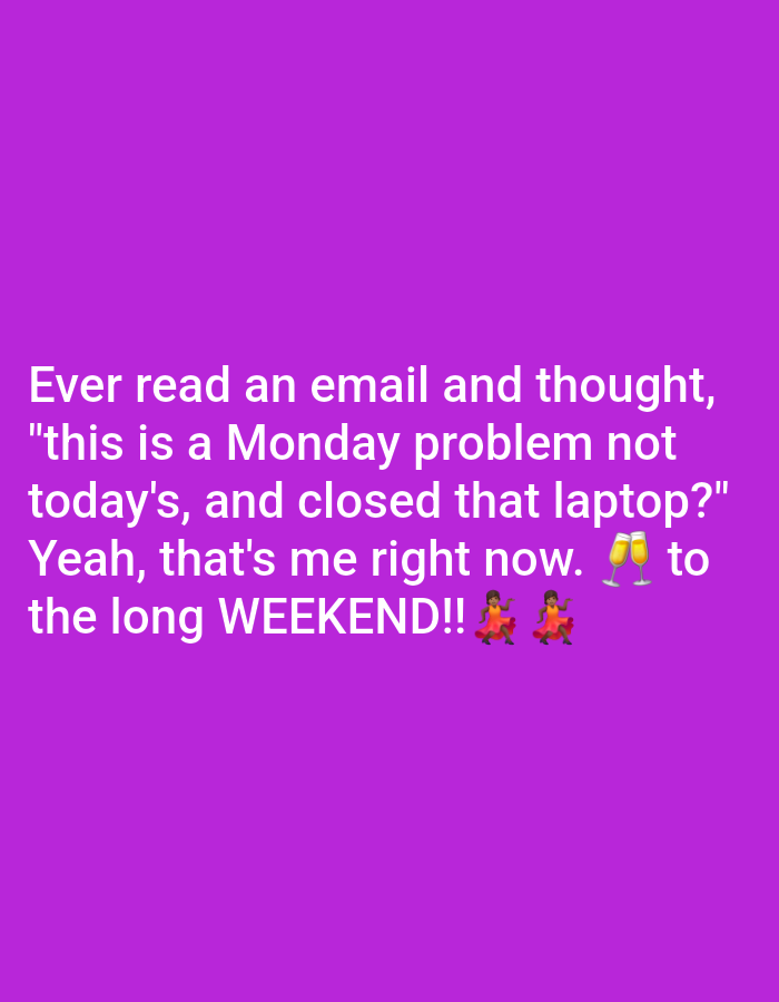 The image displays white text and emojis on a solid, untextured deep purple background. The text reads: "Ever read an email and thought, "this is a Monday problem not today's, and closed that laptop?" Yeah, that's me right now. to the long WEEKEND!!" Below the text, slightly to the right, are two emojis: two women in orange dresses dancing, followed by two clinking champagne flutes. This digital graphic contains no discernible physical objects, people, or environmental features that would indicate a specific location within Ongata Rongai, Kenya, or any other real-world setting.
