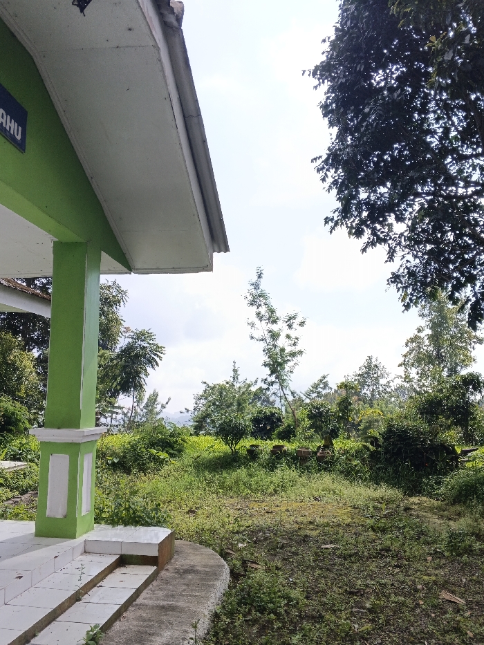 This image depicts an outdoor scene located in the city of Nanlao, China, under a bright, cloudy sky. In the foreground on the left, a section of a building features a prominent light green pillar with white trim at its base and capital, supporting a white-undersided overhang. A dark blue sign with white lettering, partially visible and ending in "AHU", is mounted on the green wall of the structure. Below the pillar, white tiled steps lead onto a concrete edge, transitioning into an unkempt grassy area. The central and right foreground consists of sparse grass, scattered weeds, and patches of bare earth. In the midground, numerous green trees and shrubs of varying heights form dense foliage, with several dark, cylindrical objects, possibly planters or pots, clustered among them. The background reveals additional trees and distant, indistinct hills or mountains under a light blue sky with dispersed white clouds. No people or animals are visible in the scene.