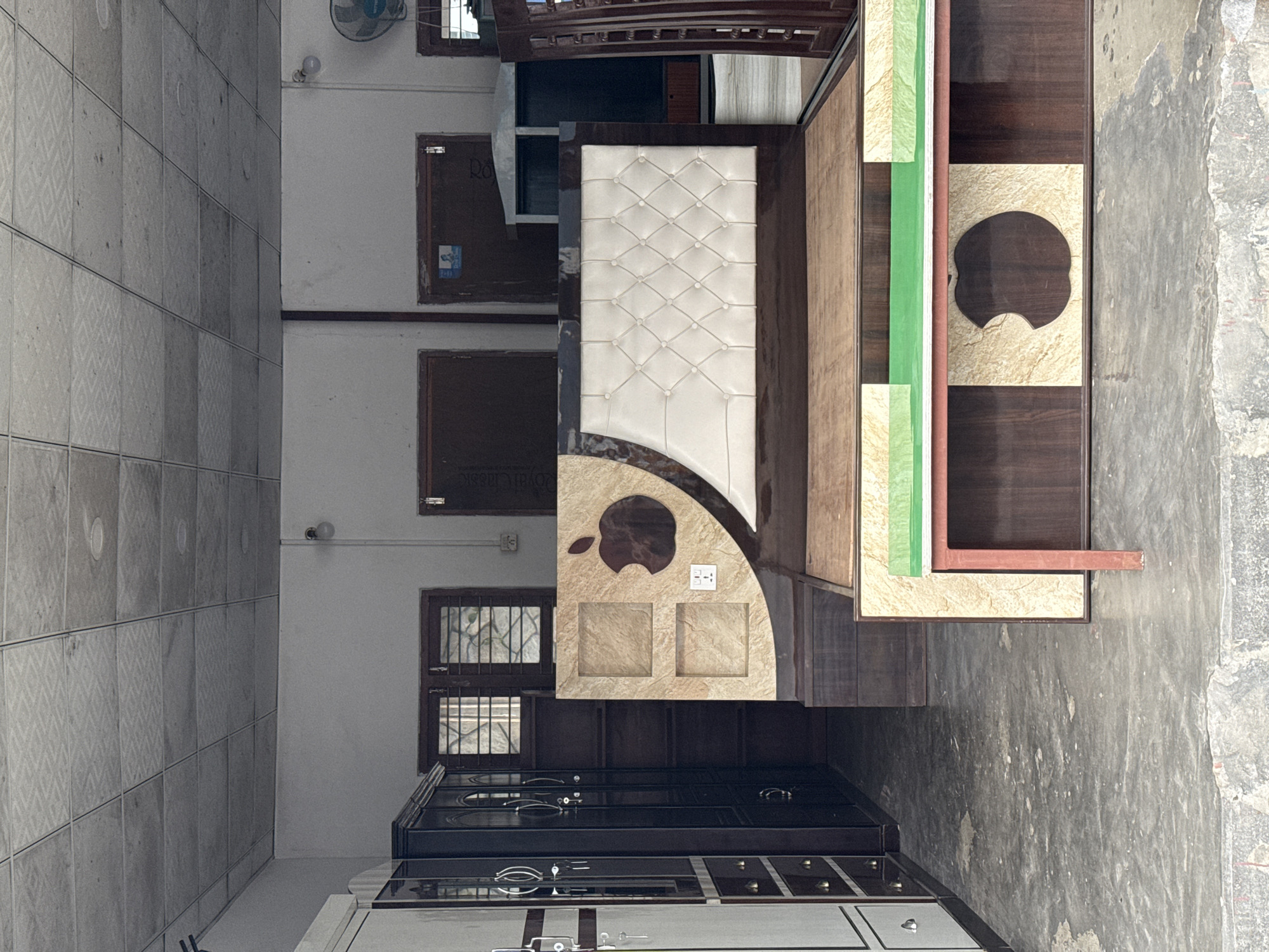 This image depicts the interior of what appears to be a furniture showroom or workshop in Pokhara, Nepal. The foreground features a large, ornate wooden bed frame. Its headboard is primarily dark wood with a central section featuring a prominent, stylized "Apple" logo cutout in dark brown against a textured, light beige panel. To the left of the logo, two recessed square sections are present within the same beige panel, and an electrical outlet with two sockets is mounted below the logo. The headboard also includes a large, cream-colored, diamond-tufted upholstered section. The bed's footboard also exhibits a dark "Apple" logo cutout against a light beige panel. A small, low table with a green top surface and dark reddish-brown legs is positioned in front of the bed's footboard. To the left, against a white wall, stands a tall, dark brown wooden wardrobe with multiple doors featuring arched glass panels and metal handles. Adjacent to it, a lighter wooden wardrobe with dark trim, multiple drawers, and keys in its locks is partially visible. Further back, an open shelving unit made of dark wood is present. The background wall features several dark wooden doors and windows with horizontal grates. One door has a blue and white sticker affixed to it. The ceiling consists of square tiles with a faint patterned design, and several exposed light bulbs are visible. A white oscillating fan is partially visible mounted high on the right wall. The floor is a rough, mottled grey concrete. No people are present in the scene.