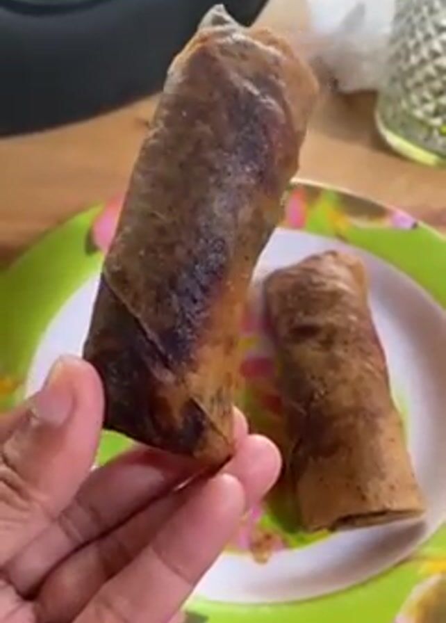 hand holding up a fried spring roll. Another spring roll is on a plate with a green, pink, and white floral design. A black handbag sits in the background, along with a glass of water. The spring rolls are dark brown, and the hand is dark-skinned.