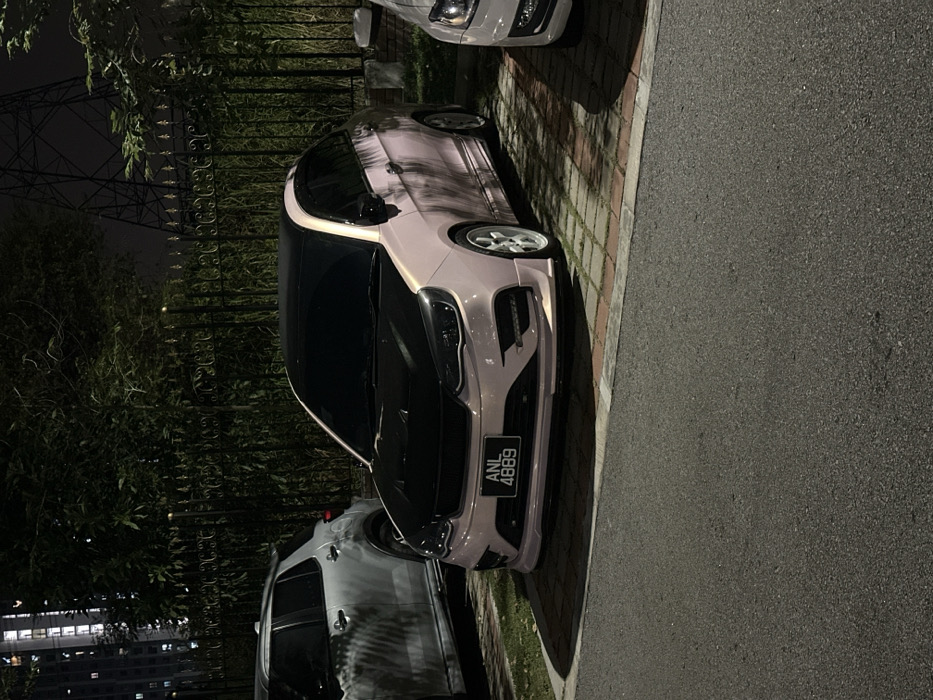 A light pink hatchback with a black hood is parked on a brick-lined curb next to an asphalt street. The car’s license plate reads "ANL 4889". Behind the hatchback is a taller, silver-colored vehicle. A dark wrought-iron fence separates the cars from a dense green bush and a distant building with multiple illuminated windows. An electrical tower is visible in the background, under a dark night sky.