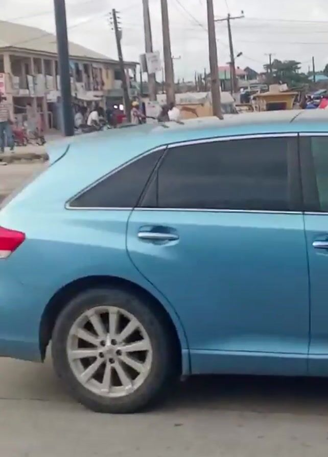 street scene. In the foreground, a blue car drives along a road. On the side of the road, there's a sidewalk with various objects including what appears to be bags of goods. People are seen milling about, some on motorcycles. There are small kiosks or stalls along the sidewalk. Overhead, power lines stretch across the scene, and a tall telecommunications tower can be seen in the distance. Another car drives by, heading the other direction on the road.