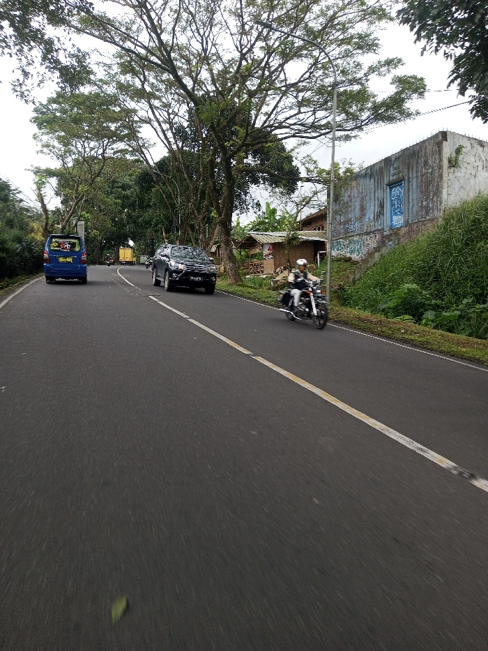 The image depicts a semi-urban road scene in Kodarapalli, India, under an overcast sky. The asphalt road features two visible lanes, separated by a dashed yellow line that transitions to a double solid line further down, and a continuous white line marking the right shoulder. A single green leaf is visible on the road surface in the foreground. Vehicular traffic includes a dark-colored motorcycle, ridden by a person wearing a white helmet and light-colored clothing, in motion on the right side of the road, approaching the viewer. Behind the motorcycle, a black SUV, identified as a Toyota Fortuner with Indonesian license plate "B 1253 VIB," is also approaching. In the distance, a blue minivan with a rear window sticker is receding in the left lane, followed by a yellow truck and other indistinct vehicles. The right side of the road is bordered by a raised, grassy embankment leading to two structures. The most prominent is a multi-story building with a weathered, light blue and grey facade, featuring a blue door or window opening and light-colored graffiti at its base. Spiked barriers are visible along the top of its retaining wall. Below and in front of this, a smaller, simpler building with a reddish-brown roof is partially visible, nestled among trees and shrubs. Dense foliage, including tall trees forming a partial canopy over the road, lines both sides of the thoroughfare. A utility pole stands on the right side.