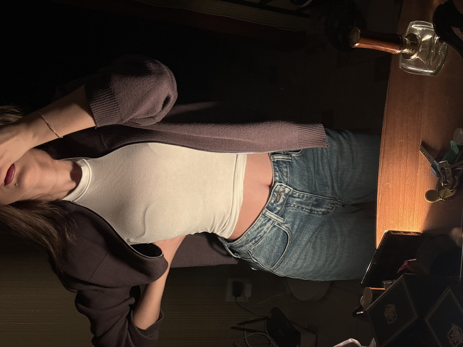 An individual, presumed female, is photographed indoors from approximately mid-thigh level upwards, within a dimly lit environment. She wears a white, form-fitting crop top, an unzipped dark purplish-brown zippered cardigan, and light blue denim jeans with an off-center button fly. A thin chain bracelet is visible on her right wrist. Her right hand is positioned to partially obscure her lower face, with painted lips visible. Her left hand rests on her left hip. Long brown hair is draped over her right shoulder. The immediate foreground features a polished wooden surface, likely a table or dresser, illuminated by a focused light source. Arranged on this surface, from left to right, are: a stack of several dark, possibly leather-bound boxes or books adorned with metallic hardware; a partially obscured dark rectangular object, consistent with a smartphone; a collection of keys attached to a keyring with a light-colored fob; and a clear glass perfume bottle with a dark, cylindrical cap. The background to the viewer's left is dark but reveals a white electrical outlet with a dark plug inserted, against a subtly textured wall. The remainder of the background is indistinct and dark. No visual information within the image provides specific identifiers for the city of Krasnodar, Russia, or any other particular geographic location.
