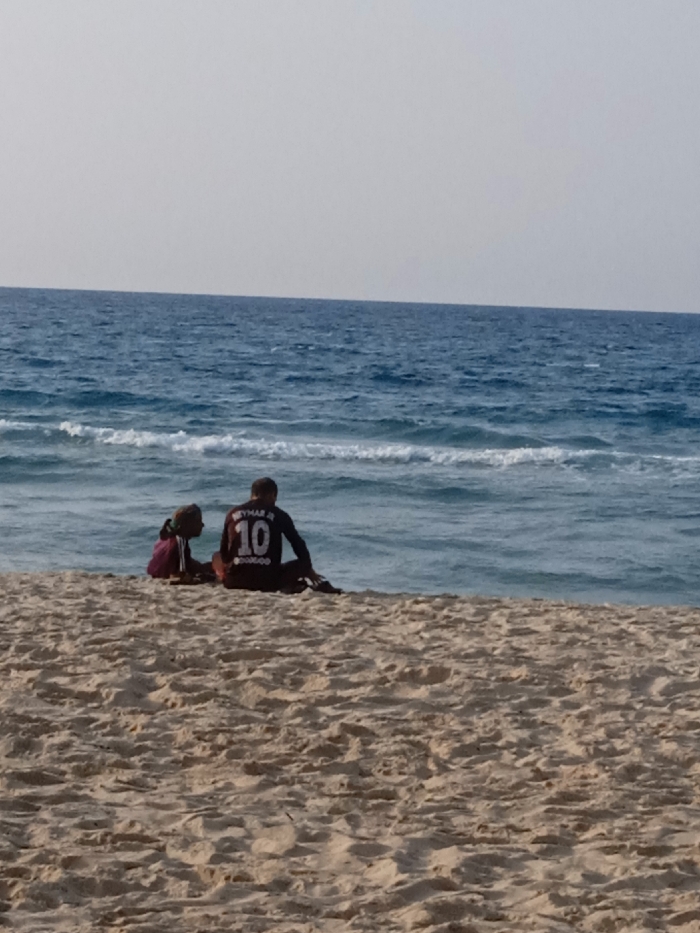 Two individuals are seated on a sandy beach, facing the ocean. The foreground consists of light brown sand with visible textures. In the midground, a body of blue and greenish-blue water exhibits white-capped waves breaking near the shore. The horizon separates the ocean from a pale blue or light grey sky. The individual on the right wears a dark, long-sleeved shirt with "NEYMAR JR" and the number "10" printed on the back. The individual on the left wears a dark reddish-purple long-sleeved top. Both are positioned with their backs partially to the viewer, observing the ocean. The scene is located in the city of Khan Yunis, Unknown.