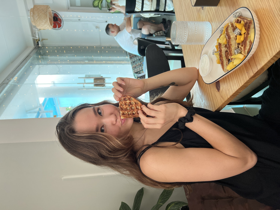 A woman with long brown hair, wearing a black top, is holding a waffle piece near her mouth, seemingly about to eat it. On the wooden table beside her is a plate of waffles with dragon fruit and mango, along with a small bowl of cream, and a glass of water. A man is visible in the background, sitting and facing the camera. The scene is inside a well-lit cafe with large windows.