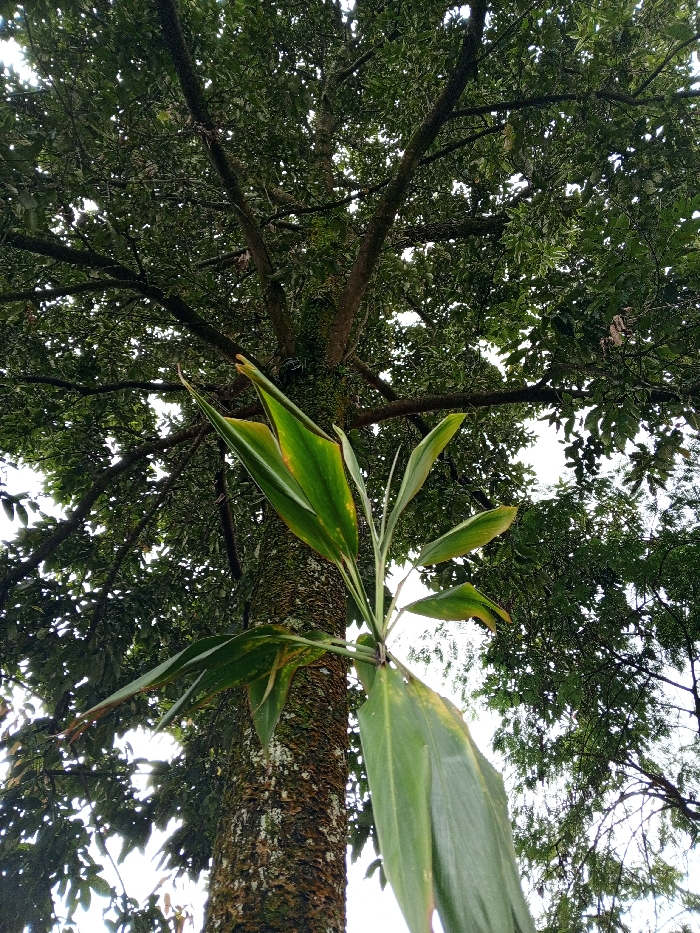 This image, captured in Pacet, Indonesia, presents an upward-looking view into a tree canopy. A prominent tree trunk occupies the lower-mid frame, characterized by rough, mottled brown and grey bark partially covered with light green lichen or moss. Attached to this trunk, approximately at the midpoint of its visible section, is an epiphytic plant featuring multiple elongated, broad green leaves, several of which display distinct yellowing and browning along their edges and tips. Above the main trunk, a network of dark brown branches extends, supporting a dense, varied green leaf canopy. Portions of a bright, white sky are visible through the gaps within the foliage.