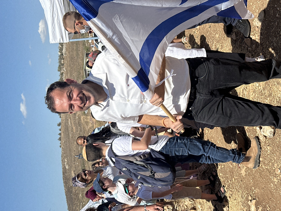 A male individual in a white short-sleeved shirt and dark trousers, with an orange wristband, smiles at the camera while holding an Israeli flag on a wooden pole in the foreground