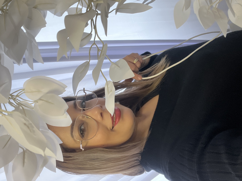An image depicts a close-up portrait of an adult female, positioned within an indoor setting in Mondeville, France. She faces forward, looking directly into the camera with a slight smile. Her hair is long, straight, and light brown with a blonde tint, parted on the left. She wears gold-rimmed eyeglasses and red lipstick. A small white earring is visible on her right ear. Her attire includes a dark-colored, V-neck top or sweater with a ribbed texture on the upper sleeve. A gold ring with a clear stone is worn on her right ring finger. The woman is situated amidst an arrangement of artificial white leaves on slender white stems. Her right hand grasps one of these stems, and a single white leaf is positioned near her lower lip. The background consists of a uniformly lit, light-colored fabric, likely a curtain or drape.