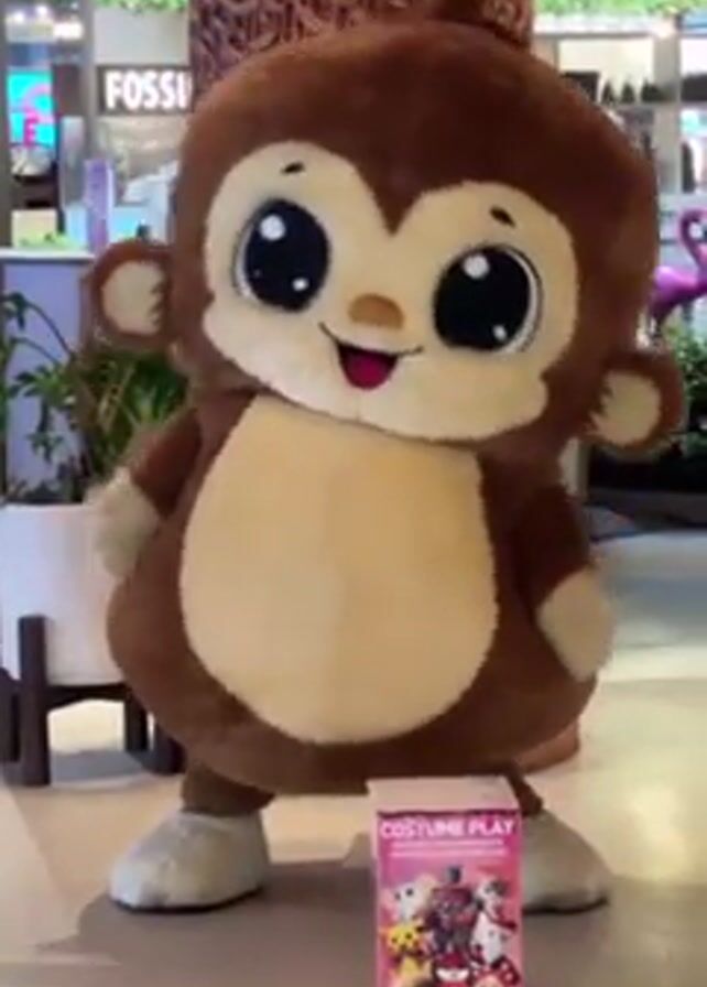 A person in a brown monkey costume with big, cartoonish eyes is standing in a brightly lit indoor space with a pink box of "Costume Play" figures on the floor in front of them