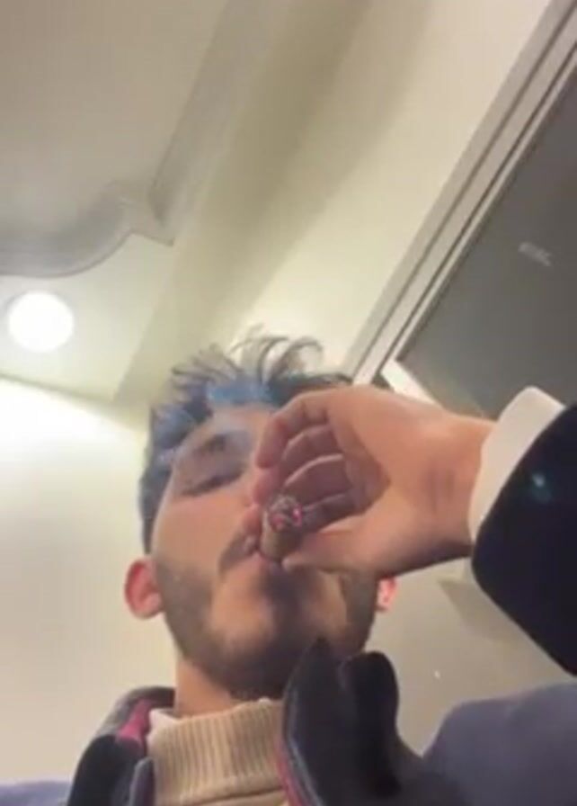 A low-angle shot shows a young man indoors smoking a cigar