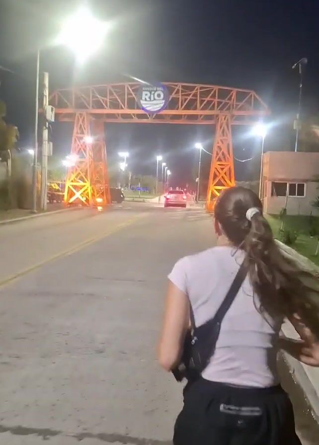 A woman runs on a sidewalk toward a lit-up, orange metal archway spanning a street at night. She has her hair in a ponytail, wears a light-colored t-shirt, black shorts, and a black fanny pack slung across her chest. The archway reads "PARQUE DEL RIO". Streetlights illuminate the area. There are cars and other structures visible in the background.