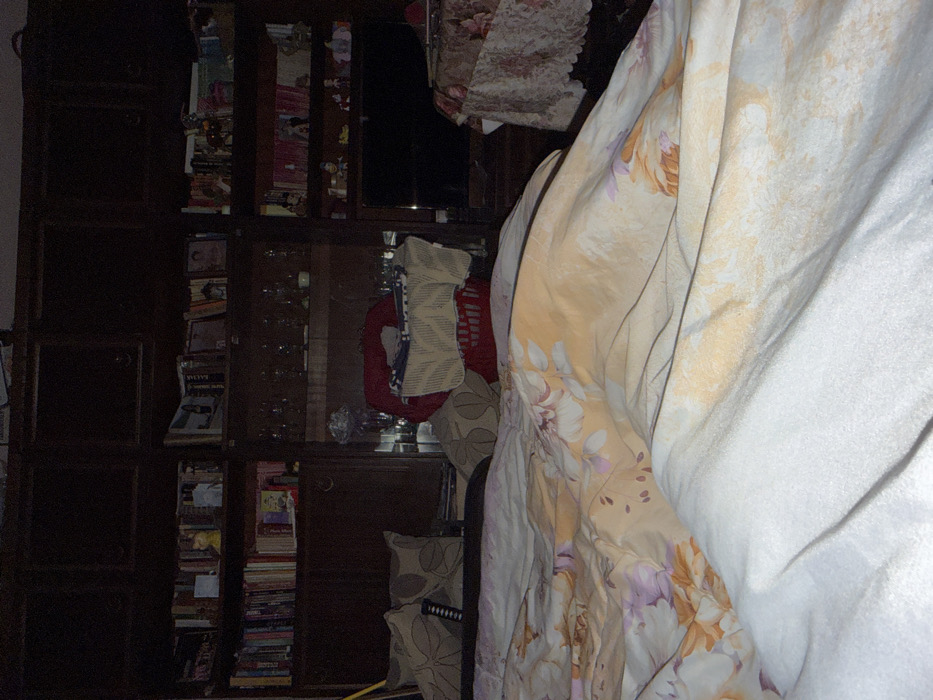 The image displays a dimly lit indoor residential scene, attributed to Nova Zagora, Bulgaria. In the foreground, an unmade bed is visible, covered by a rumpled duvet featuring a floral pattern in peach, white, and purple tones, partially revealing a white sheet underneath. To the left of the bed, two decorative pillows with a beige and dark brown circular pattern are present, with a black remote control resting on one. In the midground, a red laundry basket contains folded textiles, some exhibiting a chevron pattern. Adjacent to the basket, a clear glass object, possibly a vase or pitcher, stands on a surface. The background is dominated by a dark wooden wall unit or shelving system. The left section of this unit contains multiple shelves densely packed with books of various sizes, with a small yellow figurine visible on an upper shelf. The central section features shelves displaying several clear glass vessels, likely drinking glasses or trophies. The right section of the unit also holds books, small decorative figurines, and a dark rectangular screen, consistent with a television, mounted lower within the shelving. To the far right, a table covered with a patterned tablecloth, featuring a lace-like trim, is partially visible. No individuals, explicit actions, or direct interactions are depicted. The environment suggests a lived-in, domestic interior.