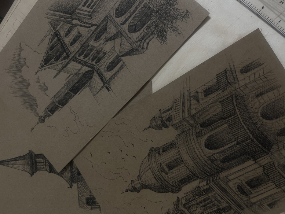 - "Three pen-and-ink architectural drawings on brown kraft paper are arranged overlapping on a light-colored wooden surface" by FM-lYGAC3, licensed under CC BY 4.0