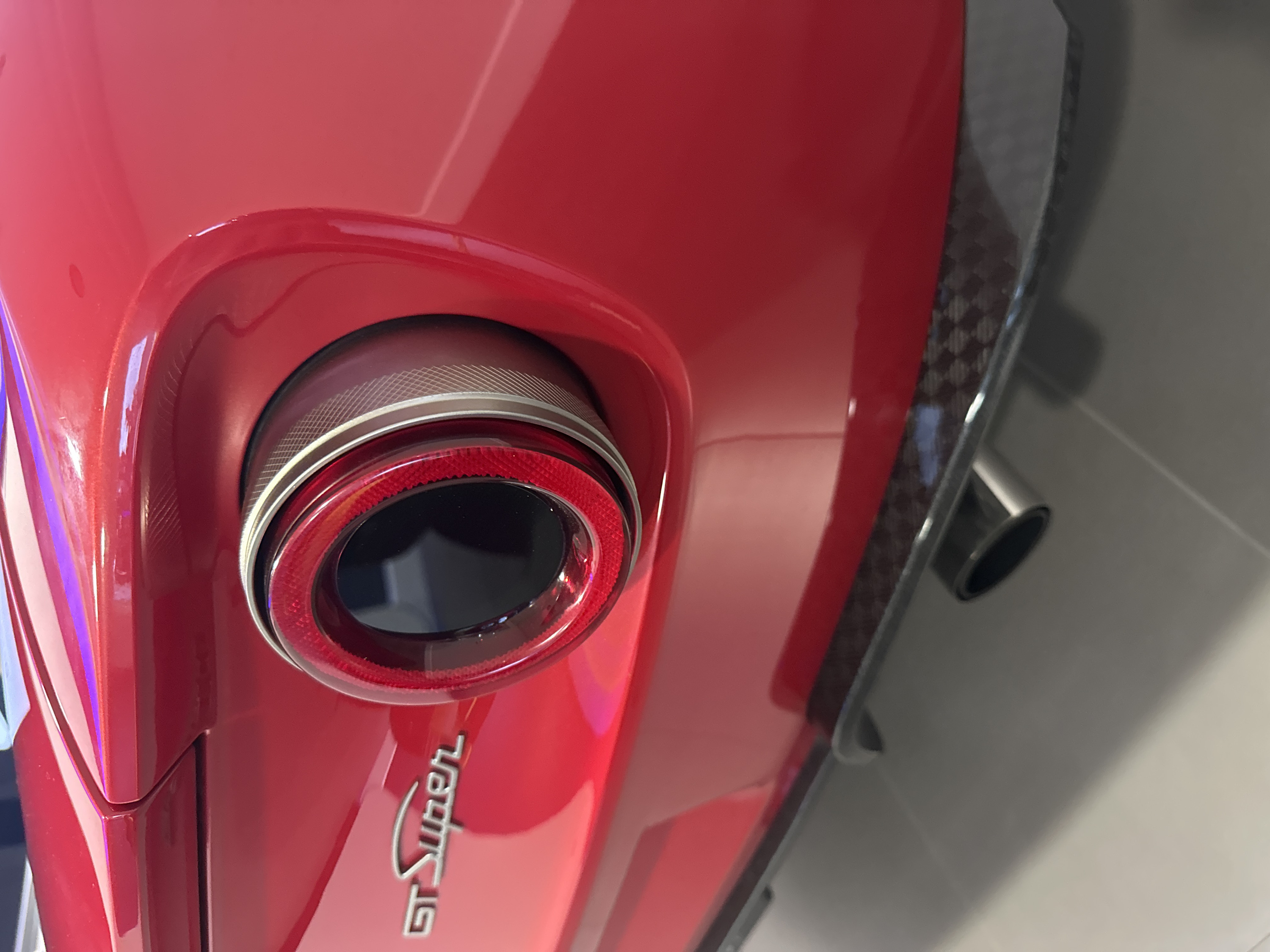 A close-up shot reveals the rear of a red sports car, specifically the "GT Super" badging. The taillight is a circular design with a black center and a textured red ring, encased in a metallic surround. To the right, a portion of the car's carbon fiber detailing and a silver exhaust pipe are visible against a gray surface. The lighting is bright, highlighting the car's glossy finish and details.