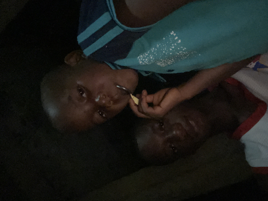Two dark-skinned children are lying down, seemingly next to each other. The child closer to the camera holds a thin, pale object near their mouth, possibly food. They both stare directly at the camera. The children wear different shirts, one teal and navy, the other white with a red neckline. The lighting is dark, making details difficult to discern.