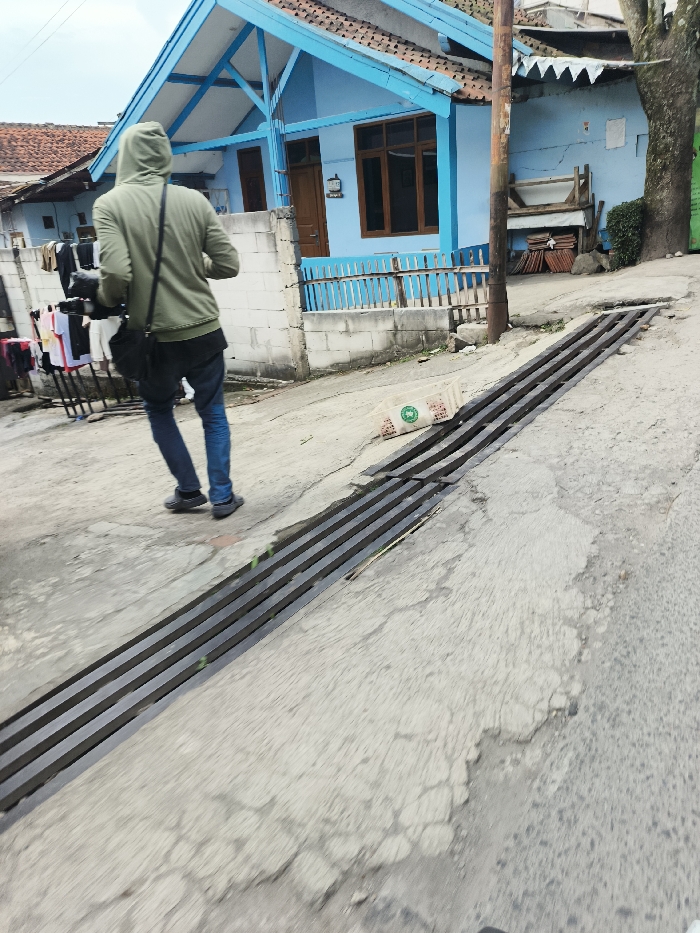 An individual wearing a green hoodie, dark jeans, and dark shoes walks away from the viewer on a cracked concrete pathway in Cimenyan, Indonesia. The person carries a black camera with a lens attached and a black shoulder bag. To the left, a white cinder block wall borders a clothes drying rack holding multiple garments, adjacent to a house with a reddish-brown tiled roof. To the right of the pathway, a long, metal storm drain grate runs parallel to the direction of travel, partially covered by a white plastic crate. Beyond the grate and a utility pole, a light blue house features a bright blue roof trim, a matching blue wooden fence, and brown wooden doors and windows. Further right, a tree trunk is visible, and stacks of construction materials, including reddish-brown tiles, are present near the house. The sky appears overcast or hazy.