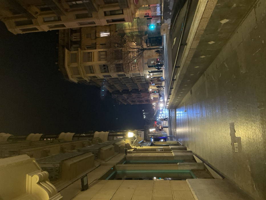 An urban scene at night presents a view down a narrow street lined with buildings. The street is illuminated by streetlights and lights from the buildings. Pedestrians can be seen walking along the sidewalk. The perspective is slightly skewed, with the viewer seemingly positioned on an elevated platform looking down at the street level. The presence of architectural details on the building suggests a historical or classic setting.