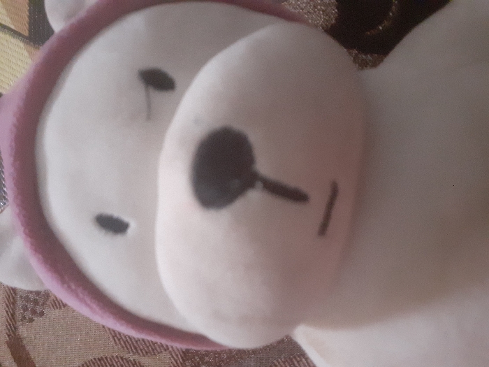 The image displays a close-up, front-facing view of a plush toy. The toy is predominantly light-colored, appearing white or off-white, and features large, rounded cheeks and a soft, possibly fuzzy texture. It is wearing a pink hooded garment that covers the top of its head and ears. The toy's face includes two dark, oval-shaped eyes; the proper left eye (viewer's right) has a horizontal line extending from its outer corner, suggesting a winking or squinting expression. Below the eyes, a prominent dark, inverted-triangle shaped nose is present, with a short vertical line descending to a small, horizontal line representing a mouth. The background is out of focus, showing blurred patterns consistent with a fabric surface in shades of brown and tan, with some glittering elements visible on the proper right side of the frame. No individuals or specific actions are depicted. The visual content of the image does not provide any discernible information to establish a specific geographical location, thus the presence of the scene in the city of Ma'raba, Syria, cannot be determined from the provided image.