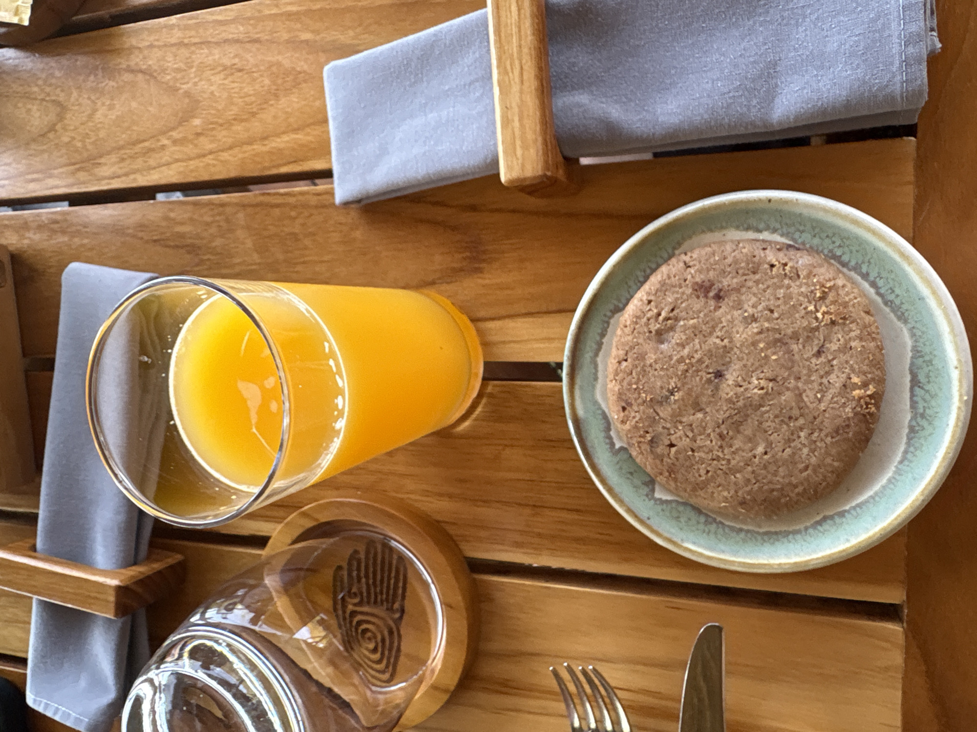 The scene depicts a tabletop setting in La Fortuna, Costa Rica. A light brown wooden slatted table serves as the primary surface. Centered in the upper portion is a clear glass containing orange juice. To its left, an overturned clear glass or carafe rests on a light brown wooden coaster adorned with a dark, stylized spiral pattern. Below the orange juice glass, positioned centrally at the bottom, is a single, round, light brown cookie on a small, round ceramic plate with a light blue-green rim. To the far left, a silver fork with four tines and a silver knife are partially visible. Two folded gray cloth napkins, each secured by a light brown wooden napkin ring, are present; one is in the upper right quadrant, and the other is partially visible in the lower right. The items are arranged consistent with a meal or snack service.