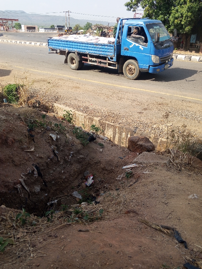 The image depicts a roadside scene in Zango-ndaji, Nigeria, under clear daylight conditions. In the immediate foreground, an irregularly shaped dirt trench or pit is visible, partially filled with discarded refuse, including plastic bags and wrappers. Sparse dry vegetation and some green plants grow on its edges. A large, dark brown rock is present on the dirt bank directly above the trench, adjacent to a concrete curb. A two-lane asphalt road with a faded yellow line runs parallel to the concrete curb. On this road, a light blue flatbed utility truck is observed traveling from right to left across the frame. The truck's bed is loaded with multiple white sacks. A driver is visible within the cab, and a second individual in a green shirt is standing in the truck's bed near the cab. The words "ELAM HOPE" are visible on the passenger-side door of the truck. The background features commercial buildings, including a petrol station with a white canopy structure, on the left. To the right, dense green trees line the road. Utility poles and lines crisscross the upper midground. Distant hills are visible against a clear, light blue sky on the horizon.
