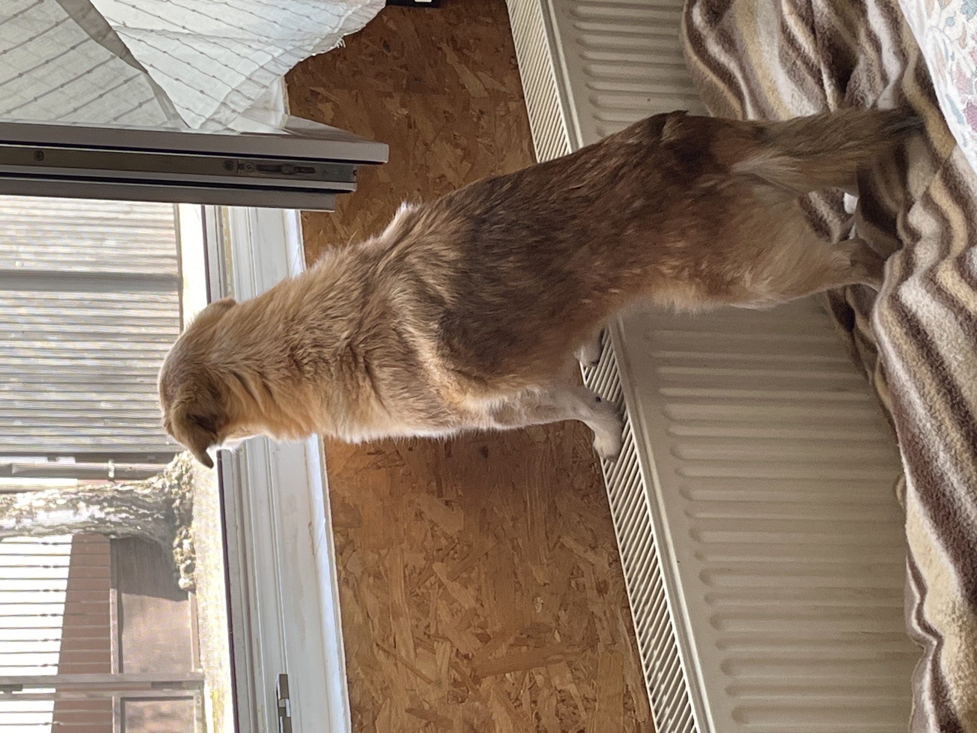A medium-sized dog with light brown and golden fur stands on its hind legs, front paws resting on the white sill of an open window, looking outwards. Its back is to the viewer. The dog's hind legs are planted on a patterned blanket with brown, tan, and cream stripes, which covers an unseen surface below a white panel radiator. The wall beneath the window and behind the radiator is constructed of OSB (Oriented Strand Board) panels. Through the clear window, an outdoor residential scene is visible, featuring a dark metal fence with vertical bars, a partially visible matching gate, and a bare deciduous tree with light-colored bark. The ground outside appears dry. A white, vertically striped curtain is partially visible on the right side, adjacent to the window frame. The scene is brightly illuminated by natural sunlight, indicating a daytime setting within the City of Zagreb, Croatia.