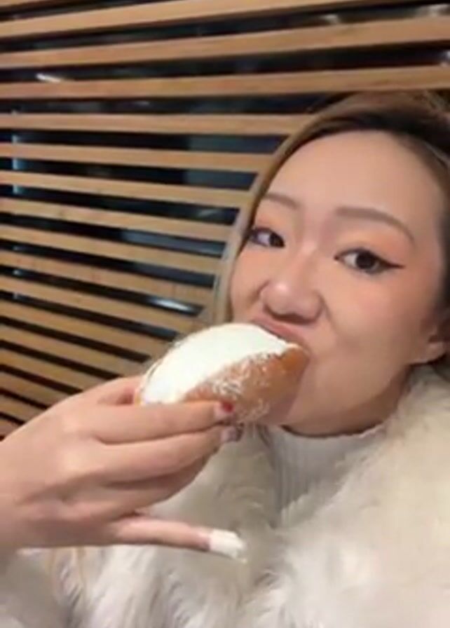 A young, fair-skinned woman with blonde-highlighted hair is eating a cream-filled pastry. She is wearing a white fuzzy jacket, and her nails are long and decorated with what appears to be dried flower petals. She has on makeup, including winged eyeliner and orange eye shadow. She takes bites of the pastry, closing her eyes in enjoyment. She is sitting in what appears to be a cafe, and a wall with horizontal wooden slats is visible in the background. There is music playing.