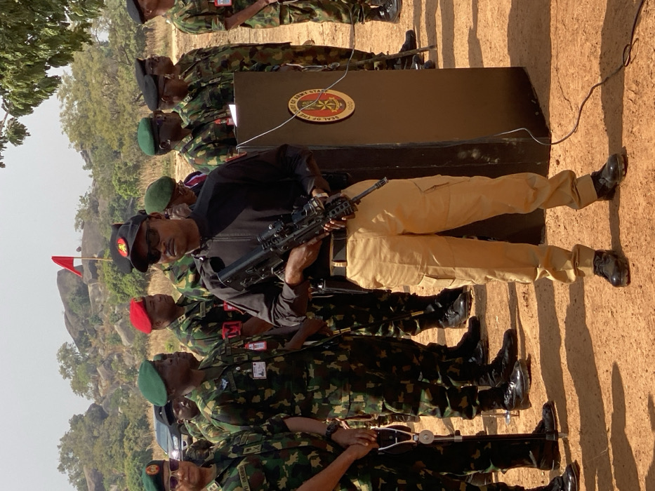 The scene depicts an outdoor gathering of military personnel in Kachia, Nigeria