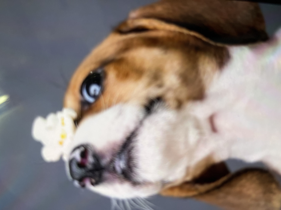 A blurry close-up captures a beagle puppy's face with a piece of popcorn stuck to its nose