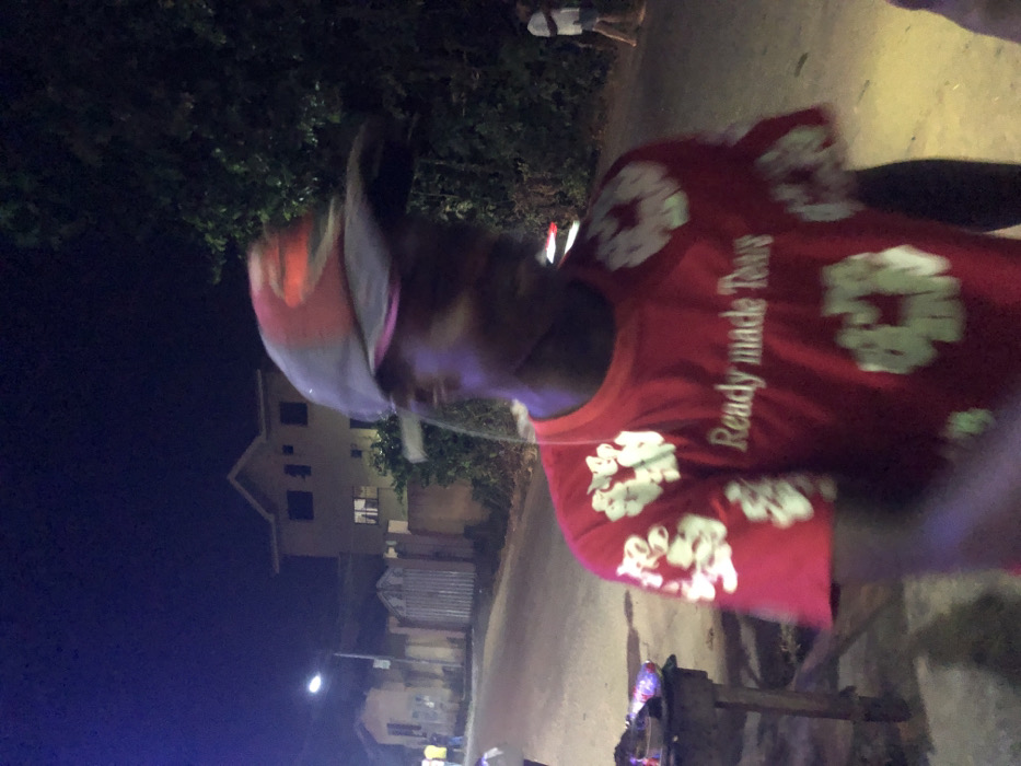 An individual is wearing a red shirt patterned with white floral designs. They also wear a baseball cap with red and white hues. The backdrop suggests an urban landscape at dusk, with a building visible in the distance. Streetlights cast a glow on the surroundings, including a road and greenery, possibly a dense bush. Other people appear faintly in the top part of the frame.