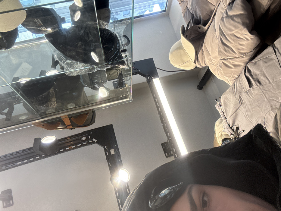 The image depicts an indoor retail environment, likely a clothing or accessory store, viewed from a low angle and rotated approximately 90 degrees clockwise