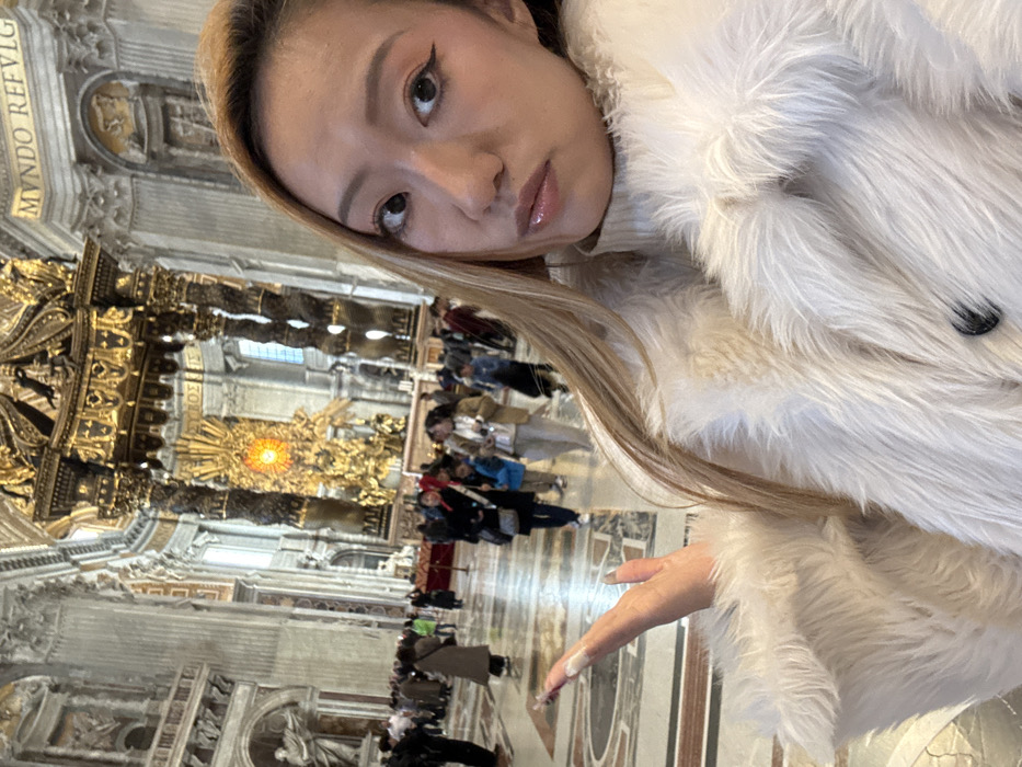 A female subject, identified as East Asian, occupies the foreground of an interior scene within St. Peter's Basilica, Città del Vaticano, Vatican City. She is positioned facing the camera, presenting a head-and-shoulders view with a neutral facial expression, featuring long, light brown hair, winged eyeliner, and glossy lips. She wears a cream or off-white faux fur coat over a light-colored turtleneck. Her left hand is raised, fingers extended with visibly long, pointed fingernails. In the midground, the bronze and gilded Baldacchino by Gian Lorenzo Bernini is prominently featured, characterized by its four spiraling columns and elaborate canopy. Behind the Baldacchino, the golden Cathedra Petri (Chair of Saint Peter) with its sunburst design and central dove is visible. The basilica's interior exhibits grand architectural elements, including massive marble columns, vaulted ceilings, intricate wall decorations, and a geometrically patterned marble floor. Numerous individuals, appearing as tourists or visitors, are present throughout the midground and far background, moving and observing the surroundings. The scene is well-lit, indicating a combination of natural and artificial light sources.