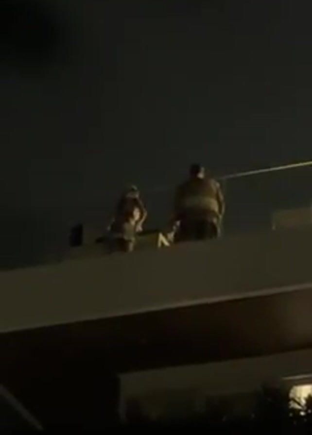 At night, two people are on the roof of a building. One is a woman in a dress, and the other is a man. The woman has a small object in her hand and is pointing it at the man, who is facing away from the camera. There is a clear barrier at the edge of the roof. The building is dark except for lights illuminating the roof, and there are trees in the foreground.
