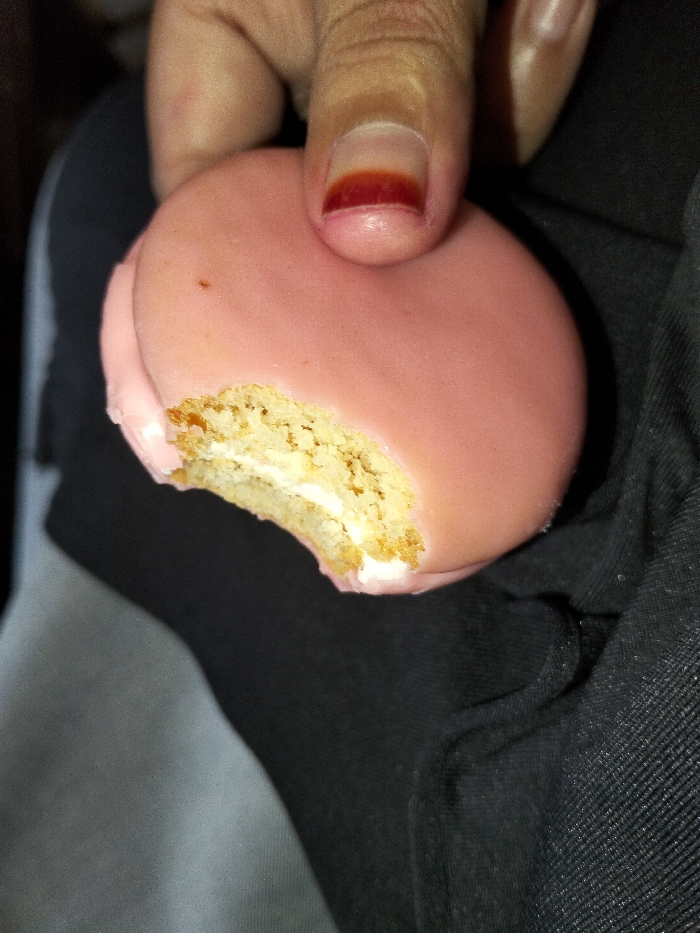 A hand holds a partially eaten pink cookie. The cookie has a bite taken out, revealing a white cream filling and a textured cookie interior. The hand's fingernail is visible and displays a dark red discoloration near the cuticle. The background shows a blend of gray and black fabric, likely clothing. The image is somewhat dimly lit.
