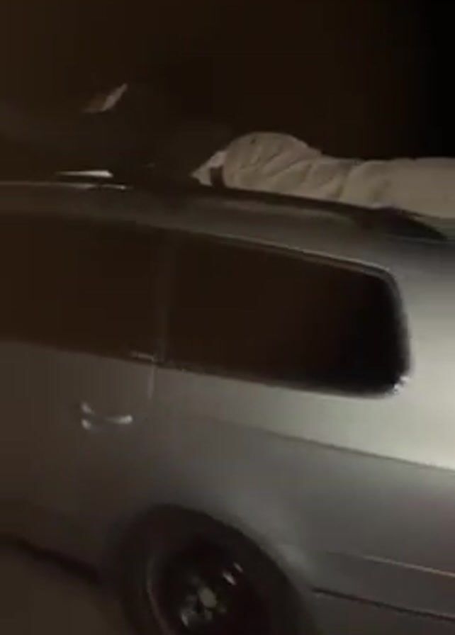 A person is shown sitting on top of a silver station wagon car at night. The car then drives away, leaving the person lying on the ground, while driving further into the darkness.
