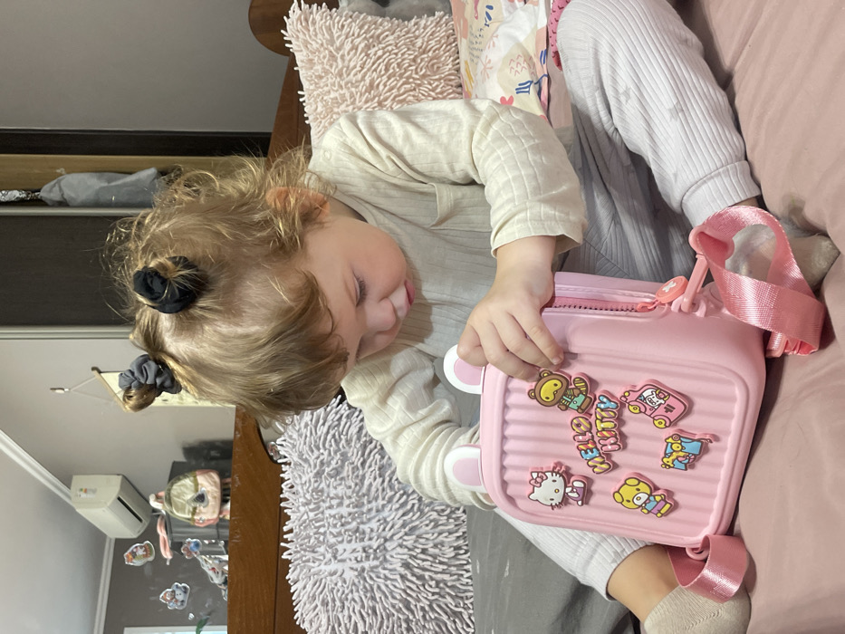 - "A young child with light brown hair styled in two small buns secured with dark scrunchies sits on a bed, looking down intently at a pink, ribbed, rectangular bag" by FM-hENj12, licensed under CC BY 4.0