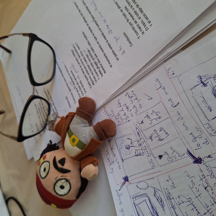 This image depicts an indoor scene on a light-colored surface, located in the city of Mariano Melgar, Peru. In the foreground, a small, multi-colored plush doll is positioned on its back, facing upwards. The doll features an exaggerated head with large, wide-set eyes, prominent eyebrows, and a small mouth, dressed in a brown hat, a light gray shirt with a green and yellow belt, and brown lower limbs. Directly behind the doll, a pair of black, cat-eye style eyeglasses with thin metallic temples rests on a stack of white papers. These papers display typed text in Spanish, with visible sections labeled "Desarrollo" and "Conclusion." To the left and beneath the doll, a sheet of paper from a notebook, filled with extensive handwritten notes, diagrams, and sketches in blue ink, is visible. This handwritten content also appears to be in Spanish, featuring arrows, boxes, and textual annotations. A partial view of a second handwritten sheet is seen underneath the first. The overall arrangement suggests a desk or workspace, possibly during a pause in work or study.