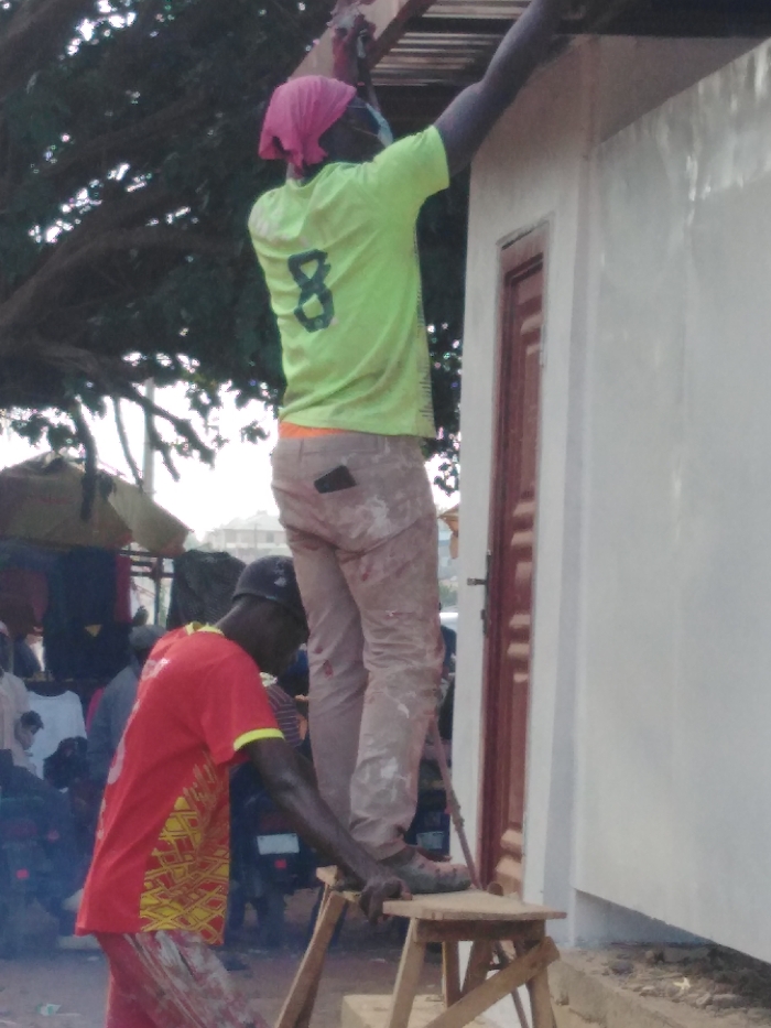 - "In Yelwa, Nigeria, two adult males are engaged in a construction or maintenance activity on a white-painted building" by FM-q4Whm1, licensed under CC BY 4.0
