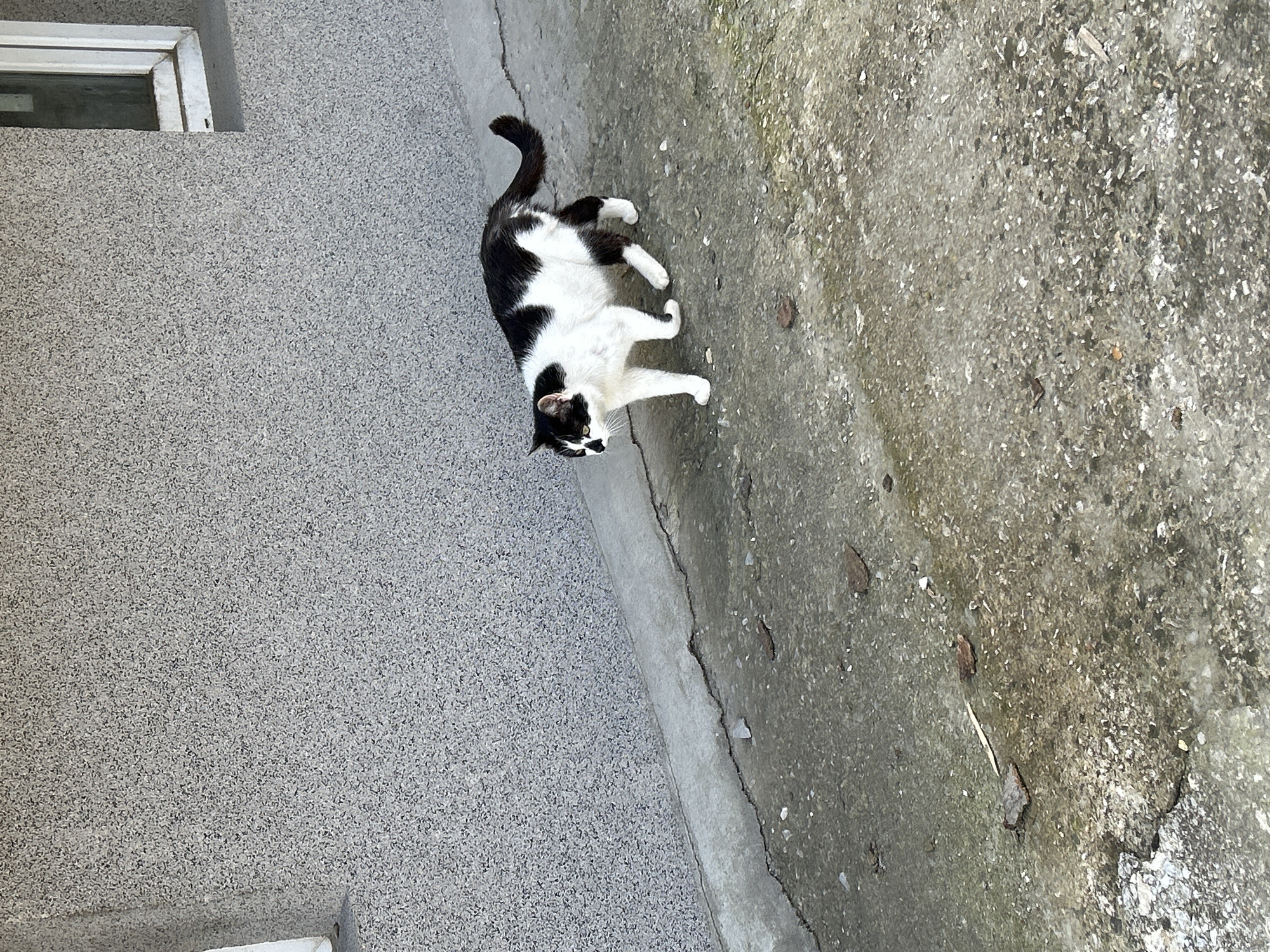 A black and white cat stands on a concrete surface. The concrete is next to a textured wall. A window is visible in the upper left corner of the frame. The scene's location is not discernible from the image.