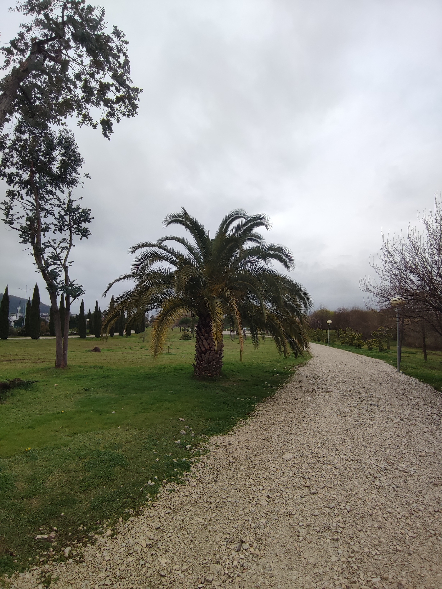 gravel pathway curving through a park setting in Sirius, Russia, under a cloudy sky. A palm tree stands on the left side of the path, rooted in a grassy lawn. To the left of the palm tree are various trees, including cypress trees and a taller bare tree. A bare tree stands to the right of the pathway, as well as a street light. The path is made of small, light-colored gravel. A background of evergreen trees and other vegetation extends into the distance. A row of cypresses lead to the mountains in the distance.